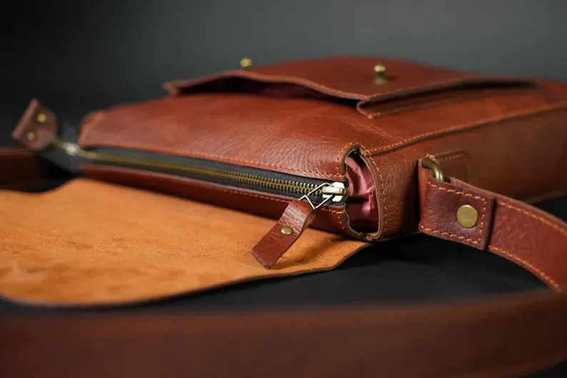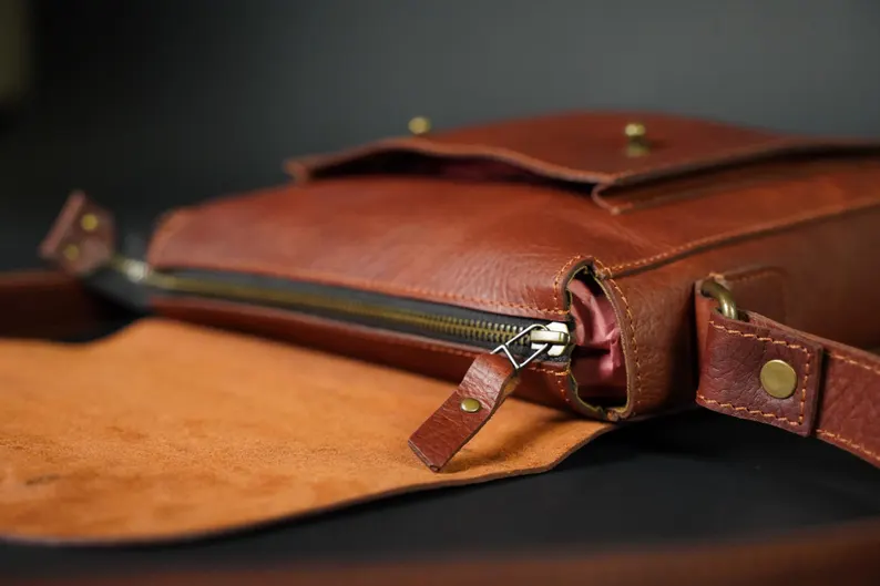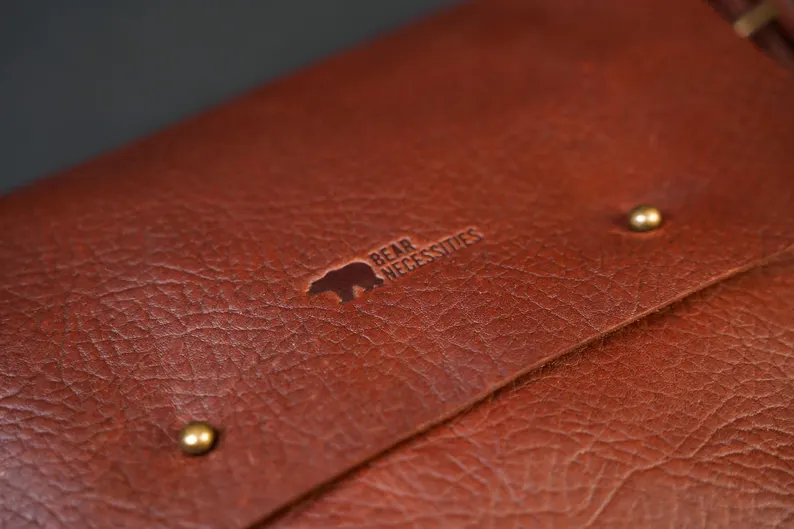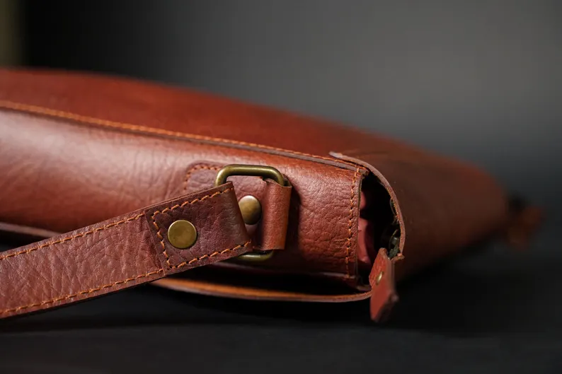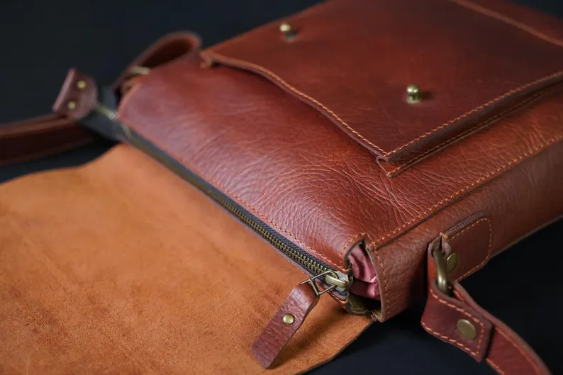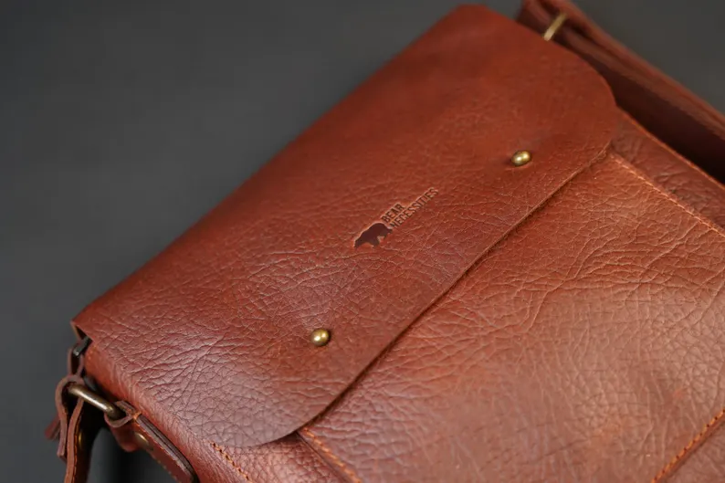 Crafted from rugged buffalo hide, this timeless unisex satchel is a testament to both durability and style. The rich tan color, with its natural variations, adds a unique character to each bag with two spacious pockets. Perfect for work, travel, and exploring new surroundings with this crossbody leather bag.